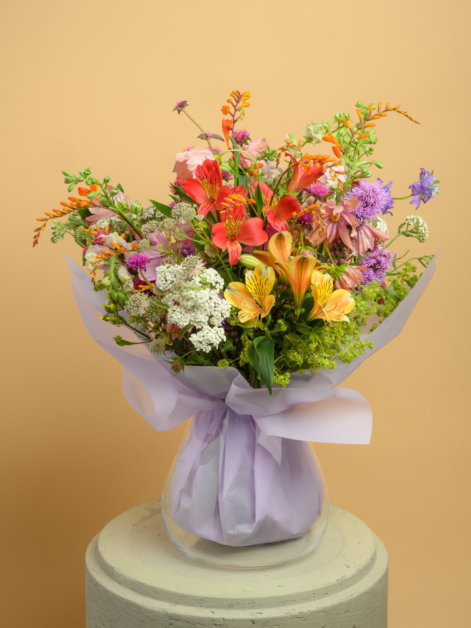 Ryški lauko gėlių puokštė iš sezoninių pievos gėlių. Puikiai tiks dovanoti pradžiuginti mamą ar draugę.