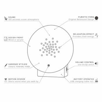 Eidami pro judesio detektorių aktyvuojate garsą. Garso lygis – reguliuojamas. Dėl kompaktiško dydžio ir praktiško baterijos veikimo galite bet kur panaudoti gaivinančią vandenyno energiją – vonioje ar svetainėje, ant biure ar balkone – nuo šiol paplūdimys visada yra vos už kelių žingsnių.
