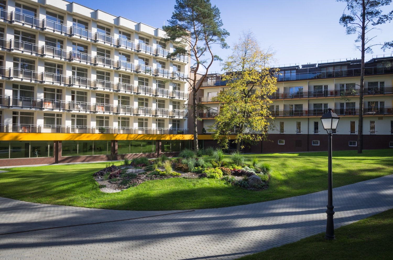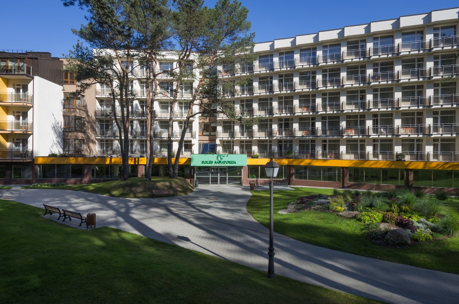Išskirtos dvi pagrindinės erdvės prie abiejų sanatorijos korpusų – ovalo formos gėlynas su fontanu ir alpinariumas. Stengtasi įsilieti į bendrą Birštono parko aplinką paliekant senąsias pušis ir neįnešant naujų elementų. Suprojektuotas medžių kamienų apšvietimas.