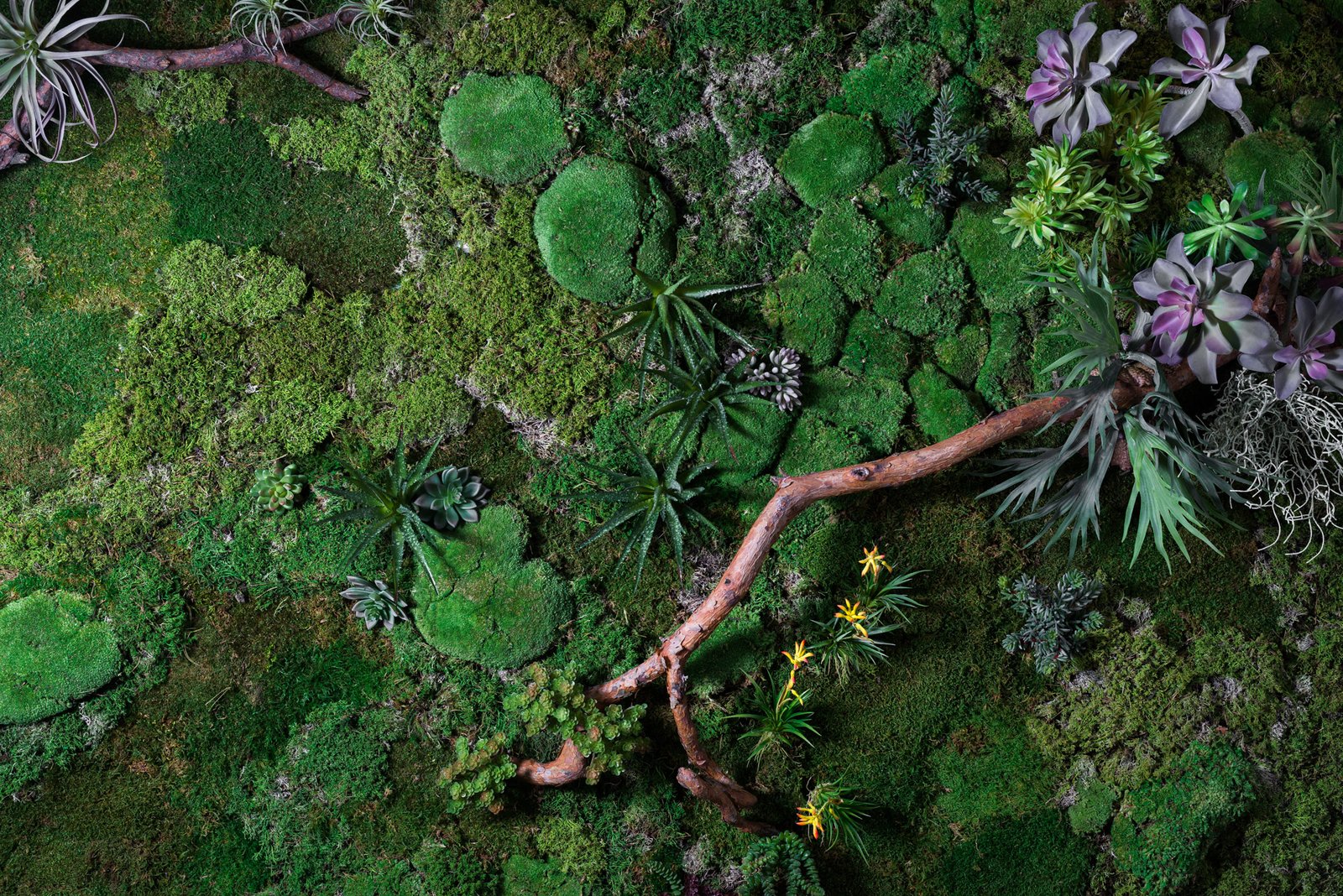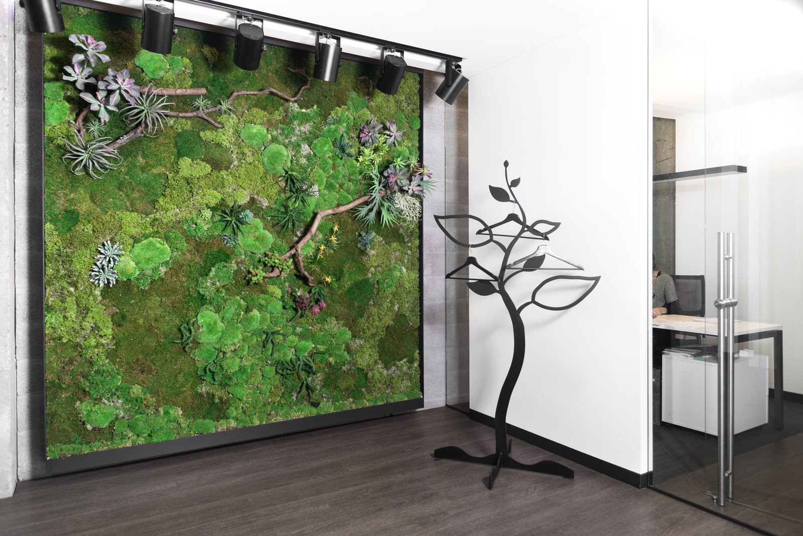 Nojaus sėklų biurą dekoravome dešimties kvadratinių metrų dydžio, visuomet žaliuosiančiu samanų paveikslu. Paveikslas pagamintas iš specialiai Olandijoje užaugintų ir apdorotų miško samanų, o ant jame esančių natūralaus medžio šakų apsikabinę puikuojasi kelių rūšių tilandsijos.